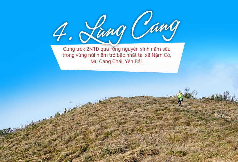 Lùng Cúng nằm ở Tú Lệ – Yên Bái, từng nằm trong top 10 đỉnh núi cao nhất Việt Nam trước khi bị soán ngôi bởi việc khám phá ra Chung Nhía Vú. Sự xa xôi cách trở về đi lại, cộng với sự phức tạp của văn hóa địa phương khiến cho đỉnh núi này dần chìm vào quên lãng. Để chinh phục Lùng Cúng có 3 cung đường chính là Chế Cu Nha, Lùng Cúng hoặc Tu San, tuy nhiên cung đường Tu San được đánh giá là đẹp nhất. Từ bản Tu San bạn sẽ được đi qua những đồi lau bạt ngàn, những rừng trúc xanh mướt mắt và đỉnh Lùng Cúng, vốn từng là bãi đáp máy bay cũ của thực dân Pháp, trải rộng với đầy những thân cỏ cao dập dìu trong gió cao nguyên.
